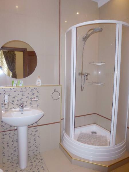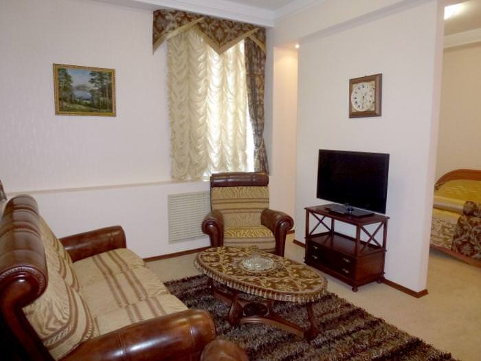 В номере: Двуспальная кровать, Плательный шкаф, Диванная зона, Санузел, душ (набор для душа: средства личной гигиены фен, полотенца, халат, тапочки), ЖК-телевизор, Холодильник, Чайник, набор для чая, кофе, минеральная вода.